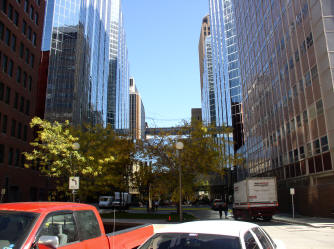 view to the east between Park Harvey Center and Court Plaza, the Leadership Square building and Skybridge across Couch Str. are seen in the background |