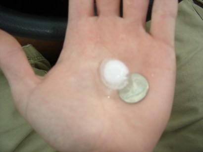 Around 5:17 pm we headed another mile northwest on Highway 11 where we found some nickel sized hail. After 5 minutes of unsuccessfully getting thru to the Ft. Worth WFO, Eric finally called Norman and had them relay the report so that explains why the timestamp on it is later at 22:30 z.