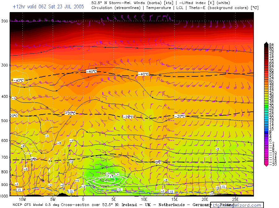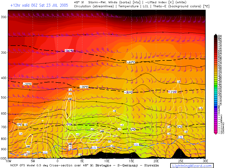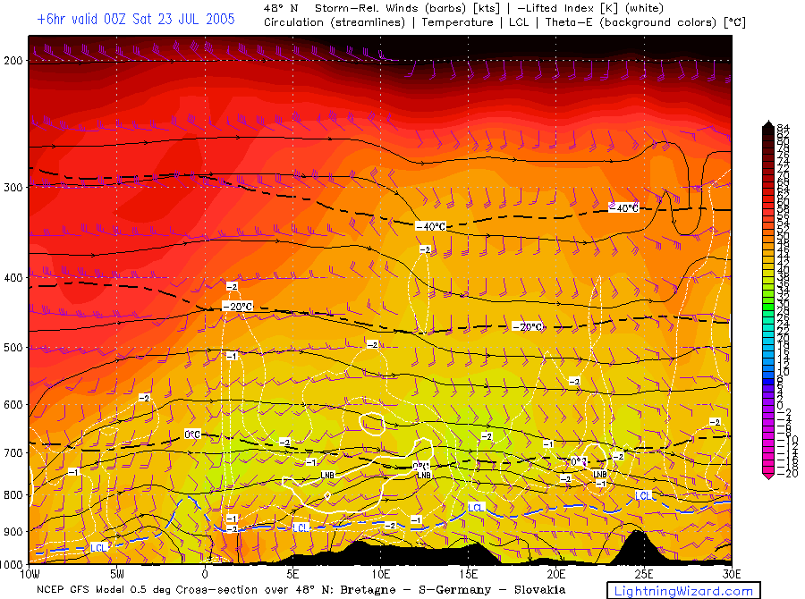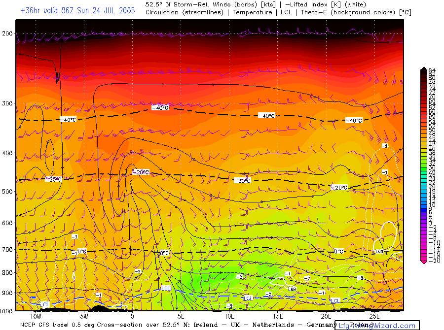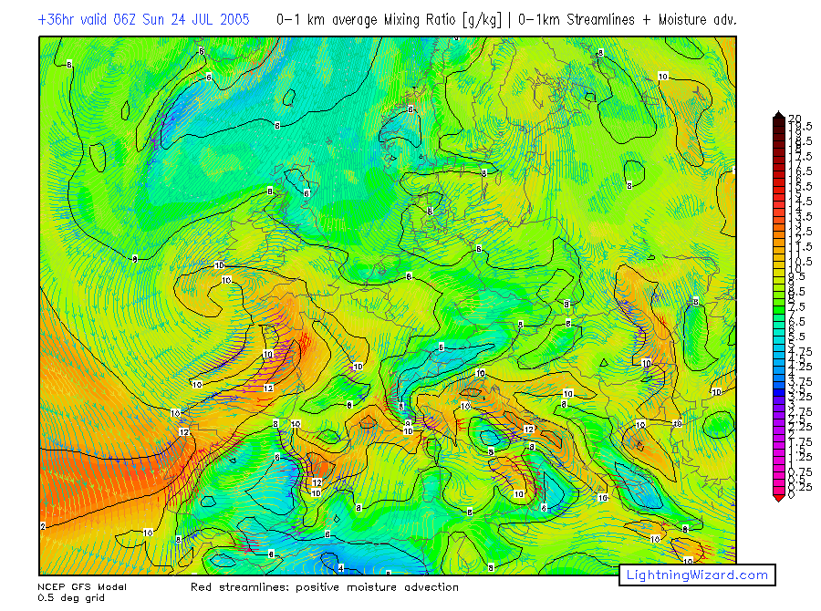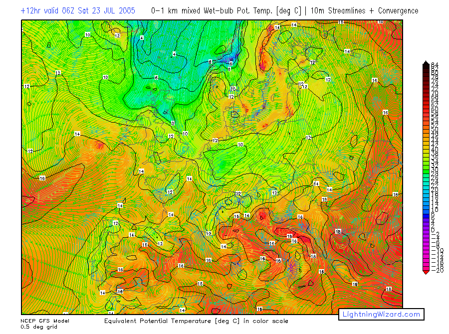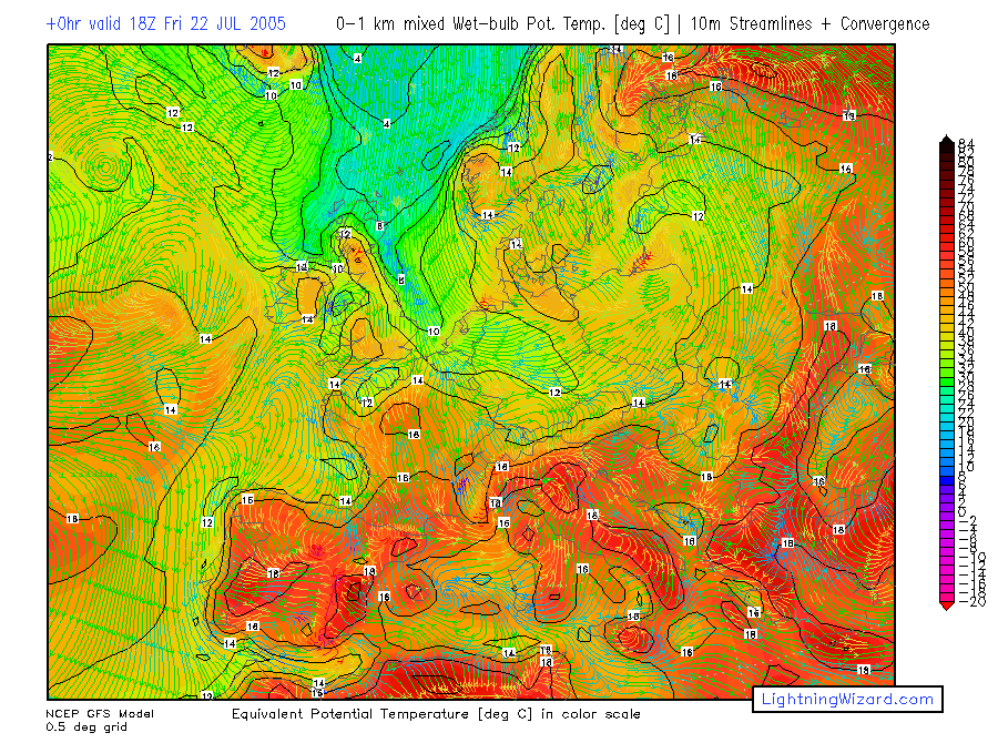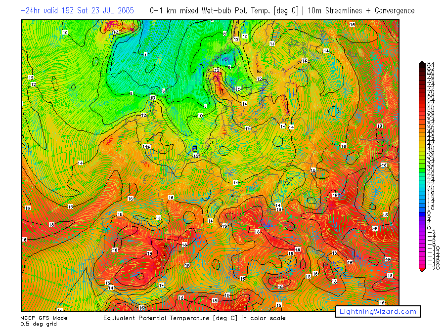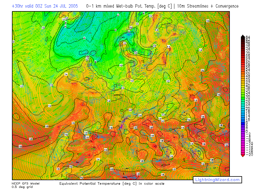 | Mixed lowest 1 km Theta-w, 10m Streamlines + Convergence |