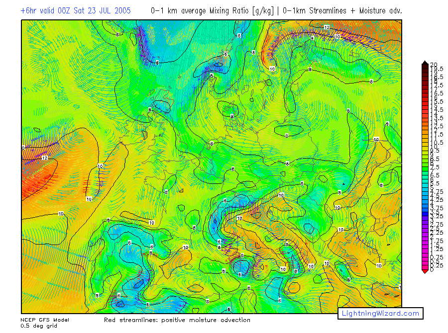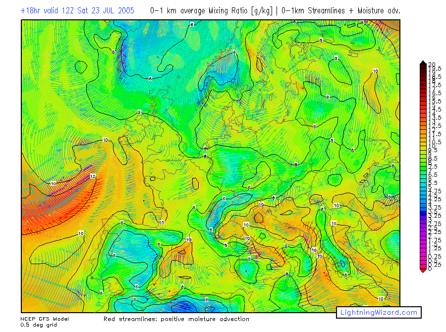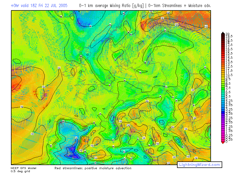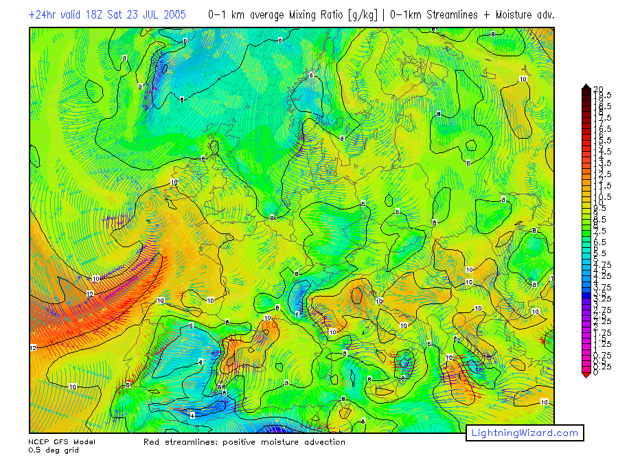 | 0-1 km avg Mixing Ratio, 0-1 km mean wind Streamlines + Moisture advection |