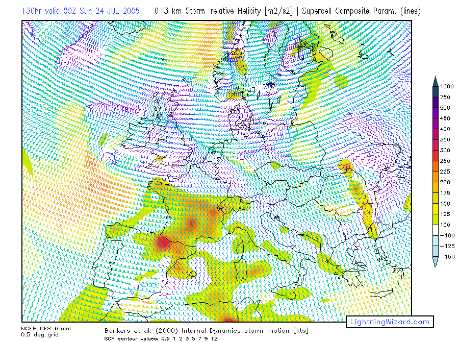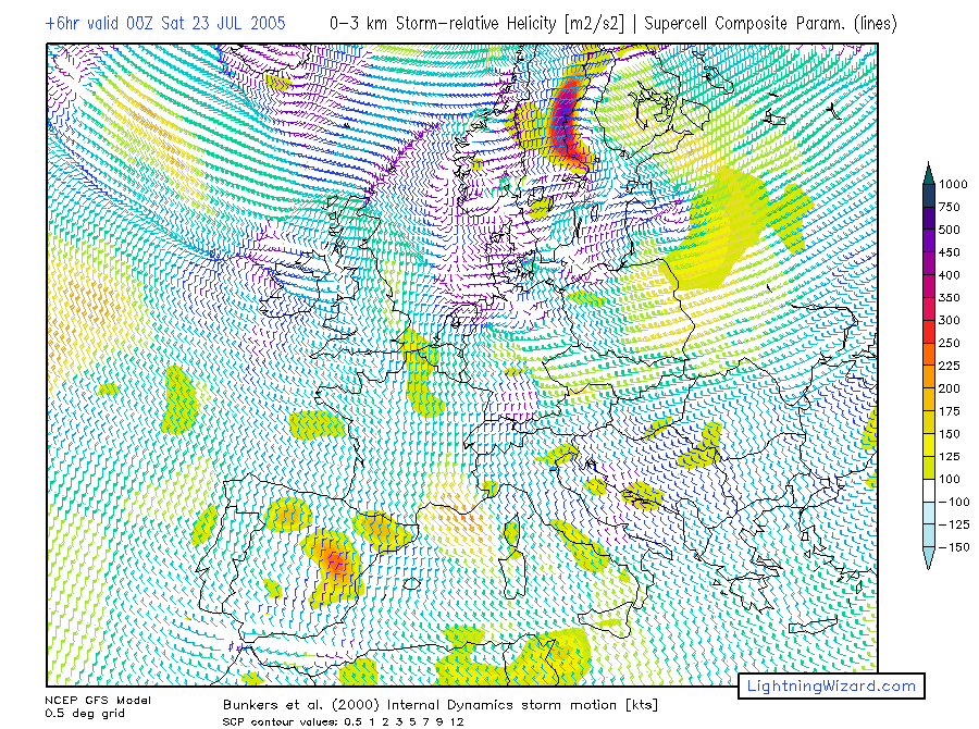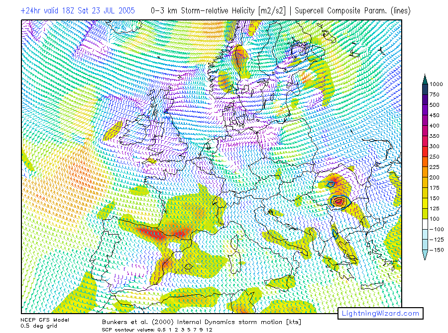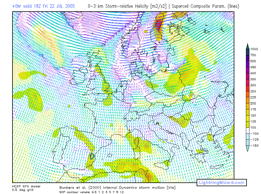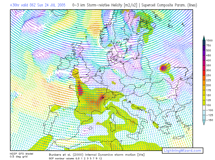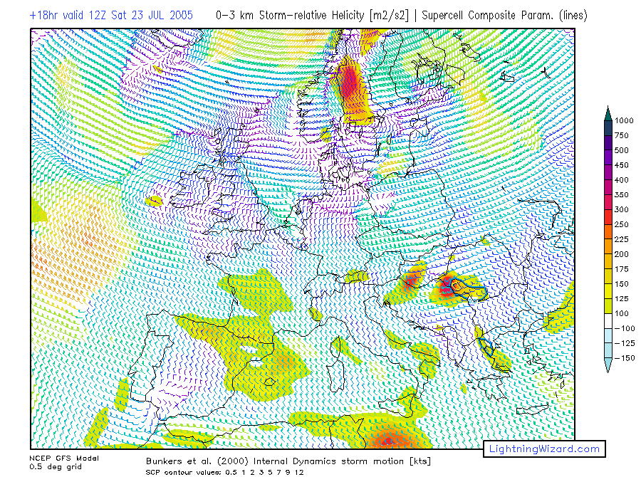 | 1000-700 Storm-rel. Helicity, Bunkers Storm Motion barbs, Supercell Composite Parameter |