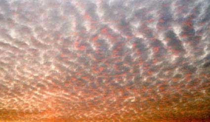 Cirrocumulus (Cc) Cirrocumulus clouds are found in the same high levels as cirrus. They appear almost like ripples over a small portion of the sky. The term "mackerel sky" is often used to describe these clouds because of their likeness to fish scales. The suffix "cumulus" is given to them because of their lumpy appearance. Latin Derivatives: cirrus - "curl of hair" and cumulus - "heap" |