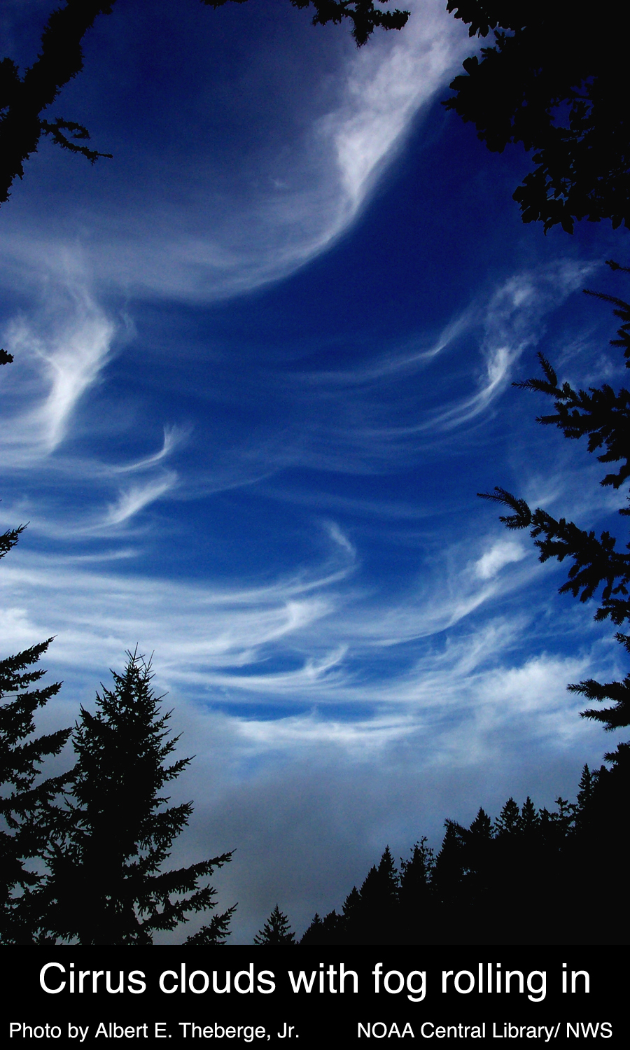 Cirrus (Ci) Cirrus clouds are composed mainly of ice crystals due to their height in the atmosphere (6000 m, 20,000 ft and above). The dryness of the air higher in the atmosphere contributes to their thin, wispy look. These clouds generally occur with fair weather and are the ones usually responsible for those beautiful midwestern sunsets. They usually indicate the direction of the winds at their elevation. The "tails" demonstrated in the photo at the left are commonly called "mares' tails". These clouds are also responsible for Wichita meteorologist Dave Freeman's favorite phrase: "Nothing serious, just a little cirrus!" Latin Derivative: cirrus - "curl of hair" |