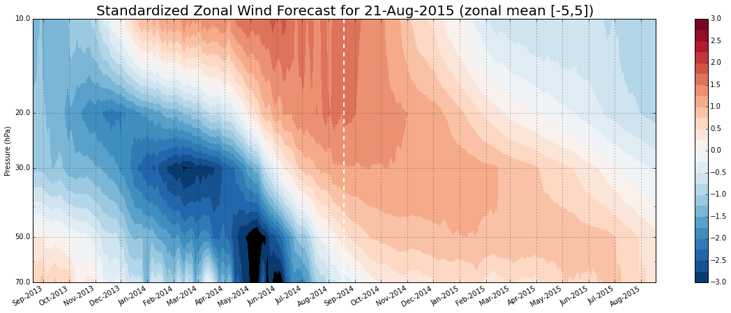 30mb standardized wind forecast. The forecast is derived from the behavior of past cycles at the current phase. The past cycles plotted are color coded by similarity.