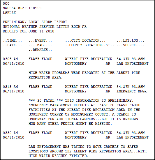 On June 10, 2011, an MCV moved through Texas and Arkansas, dumping up to 7 inches of rain in the Albert Pike Recreation Area, located in the Ouachita National Forest in southwestern Arkansas. The localized heavy rain led to deadly flash flooding along the Little Missouri River, which swept through the campgrounds in the Albert Pike Area during the early morning hours, killing around 20 people.