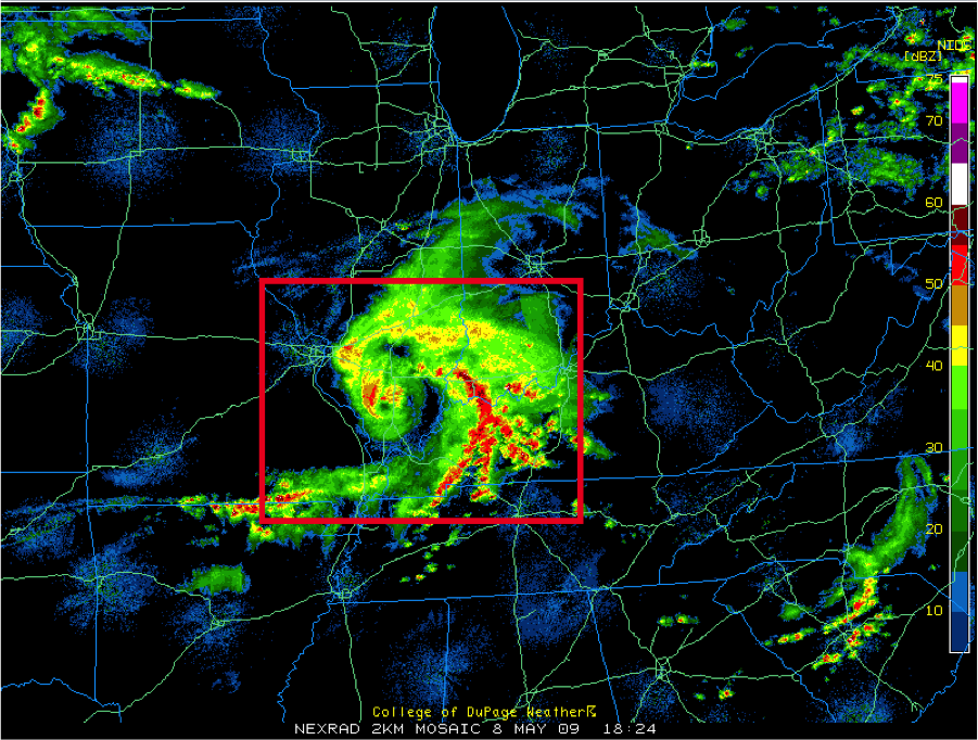 Image 3: May 9, 2009 MCV enclosed in red box. Related to strong winds and tornadic conditions.